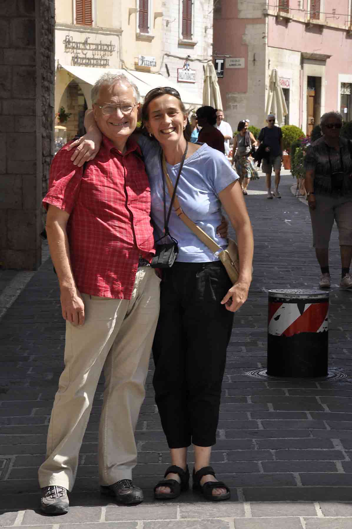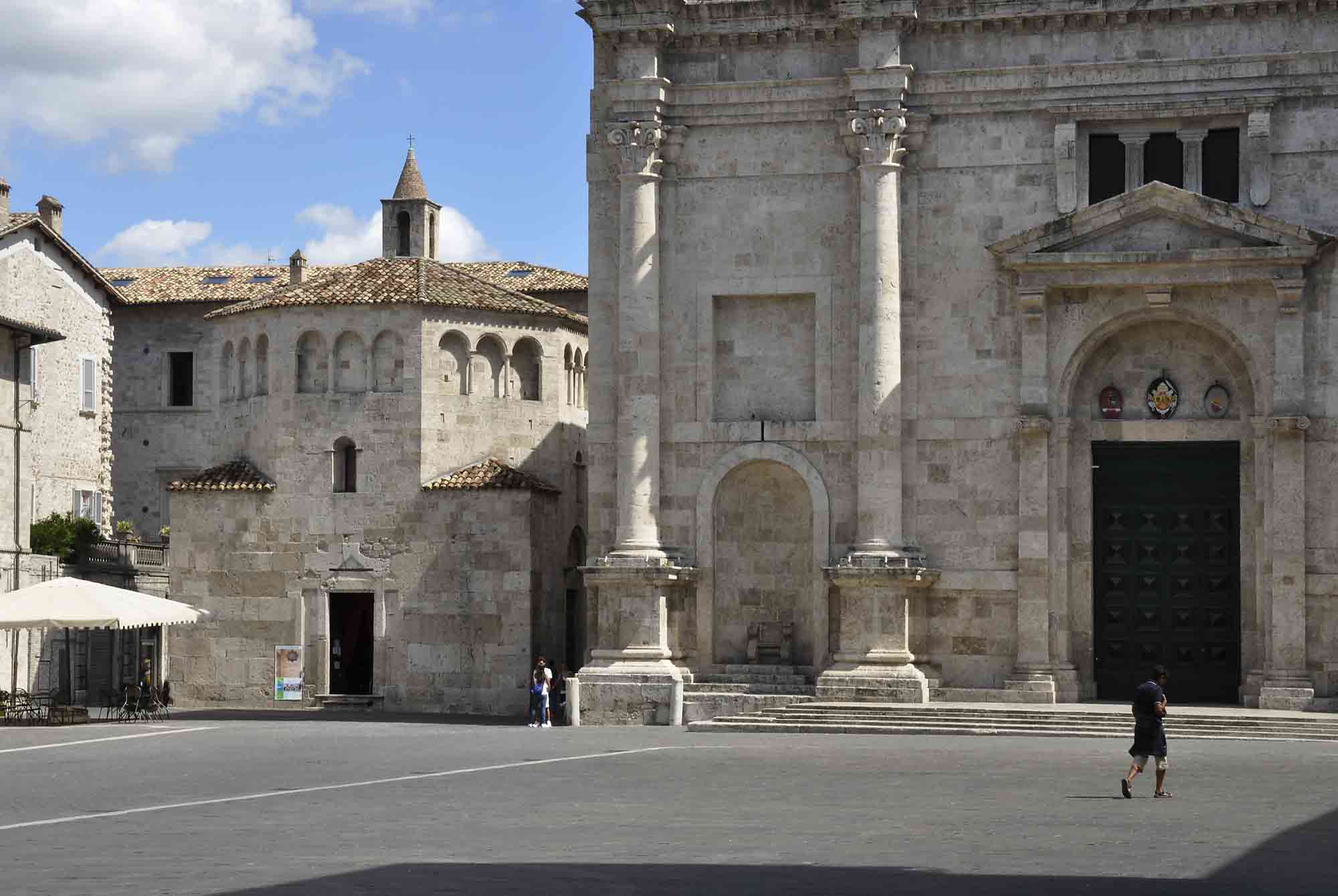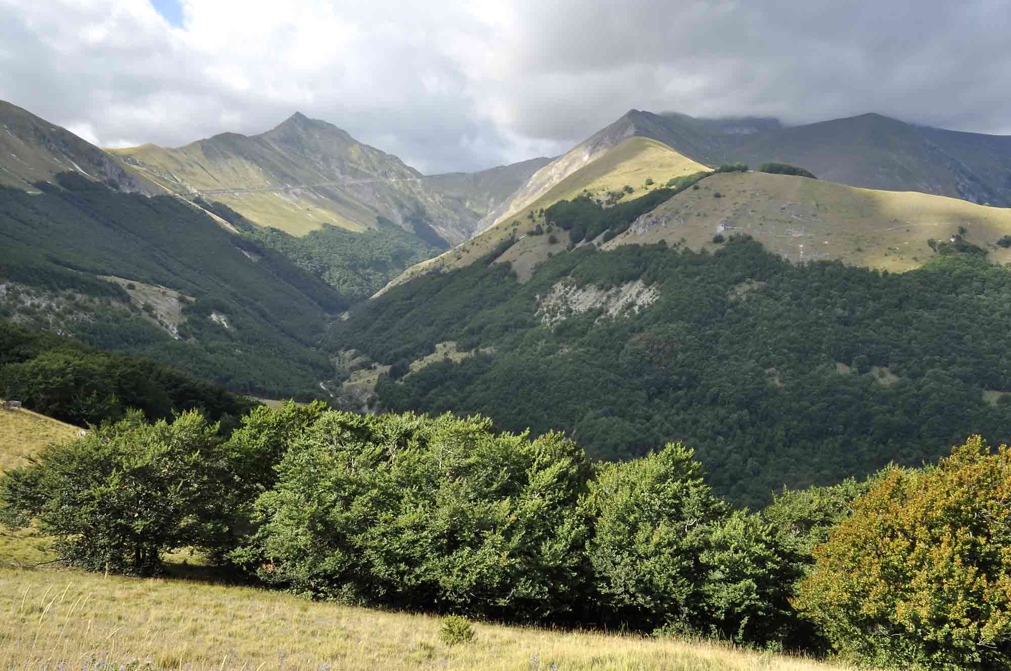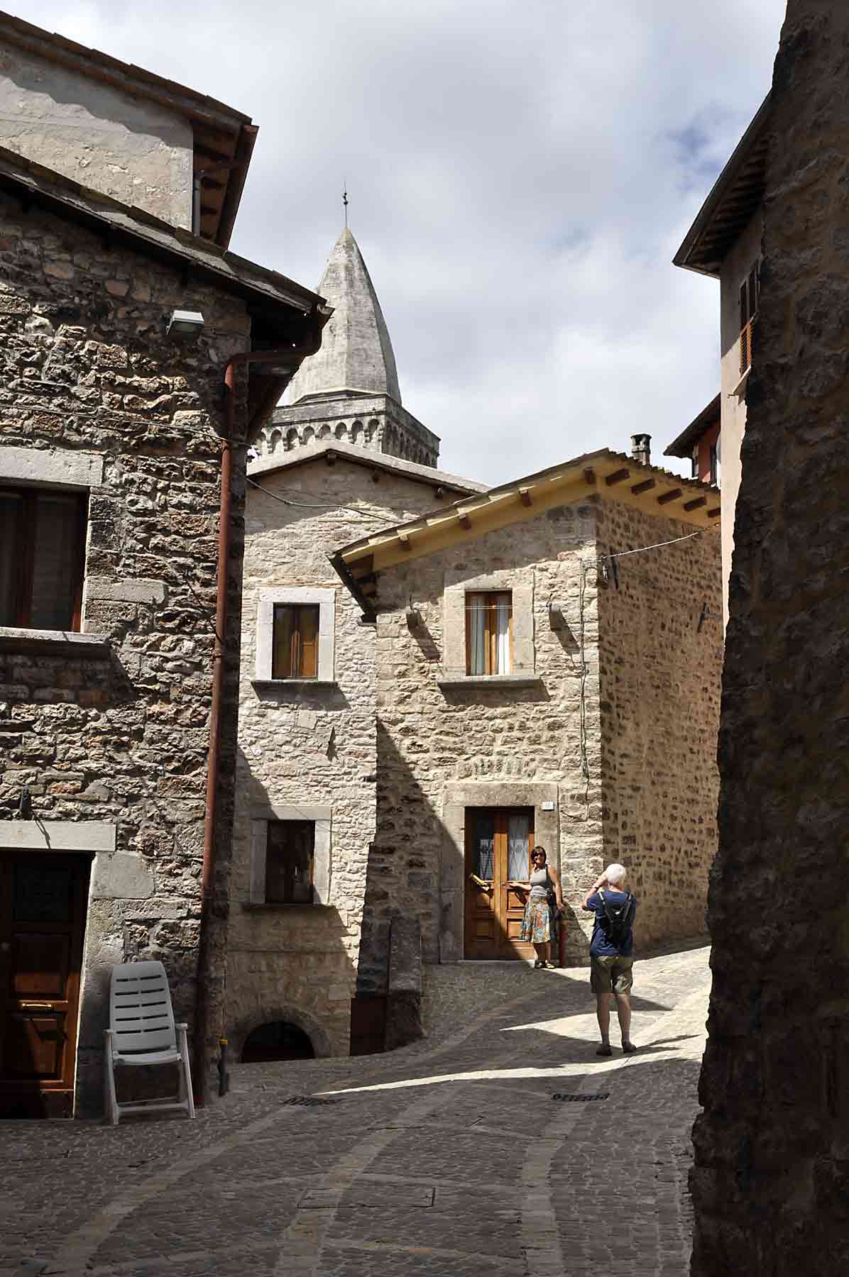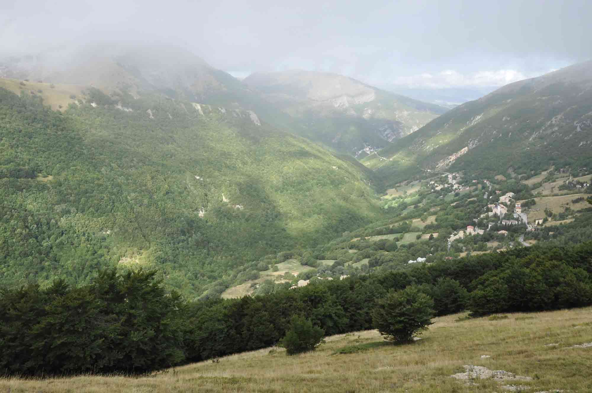 Następnego dnia (niedziela) pogoda była ładna, a w górach nie odczuwało się już takiego upału jak w Rawennie. Wyruszyliśmy autobusem na objazd Gór Sybillińskich. Droga wspięła się najpierw serpentynami na przełęcz s. Maria Maddalena (1515 m), a następnie jeszcze stromiej opadła w dolinę rzeki Fiastrone. Pierwszy dłuższy postój był w Visso, świetnie zachowanym średniowiecznym miasteczku, całym z kamienia, gdzie znajduje się siedziba parku narodowego. Dalej położone na skale opactwo s. Eutizio i Norcia – rodzinne miasto św. Benedykta. Norcia terytorialnie należy do Umbrii, tym samym nawiązaliśmy do poprzedniej wycieczki. Objechaliśmy góry od południa i przez Amandolę wrócili do Sarnano, które okazało się również czarującym miasteczkiem, dla odmiany zbudowanym z cegły.