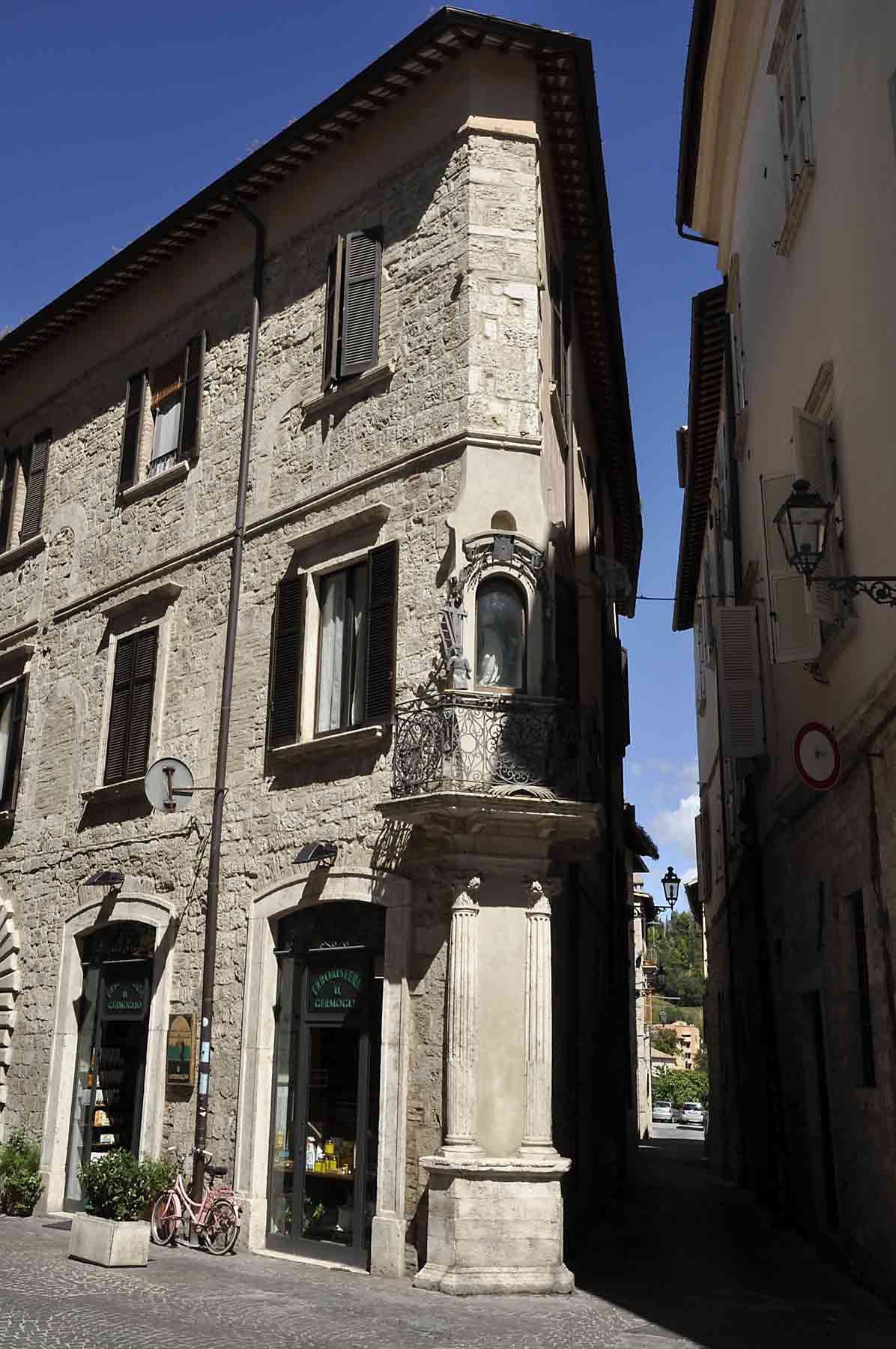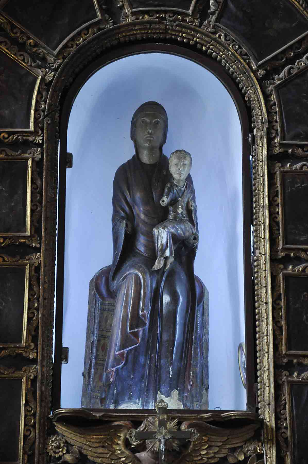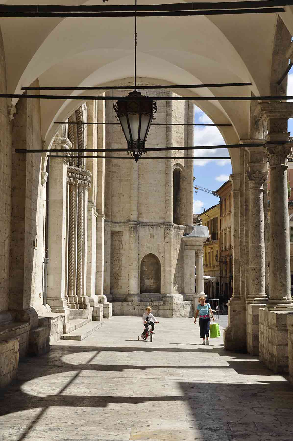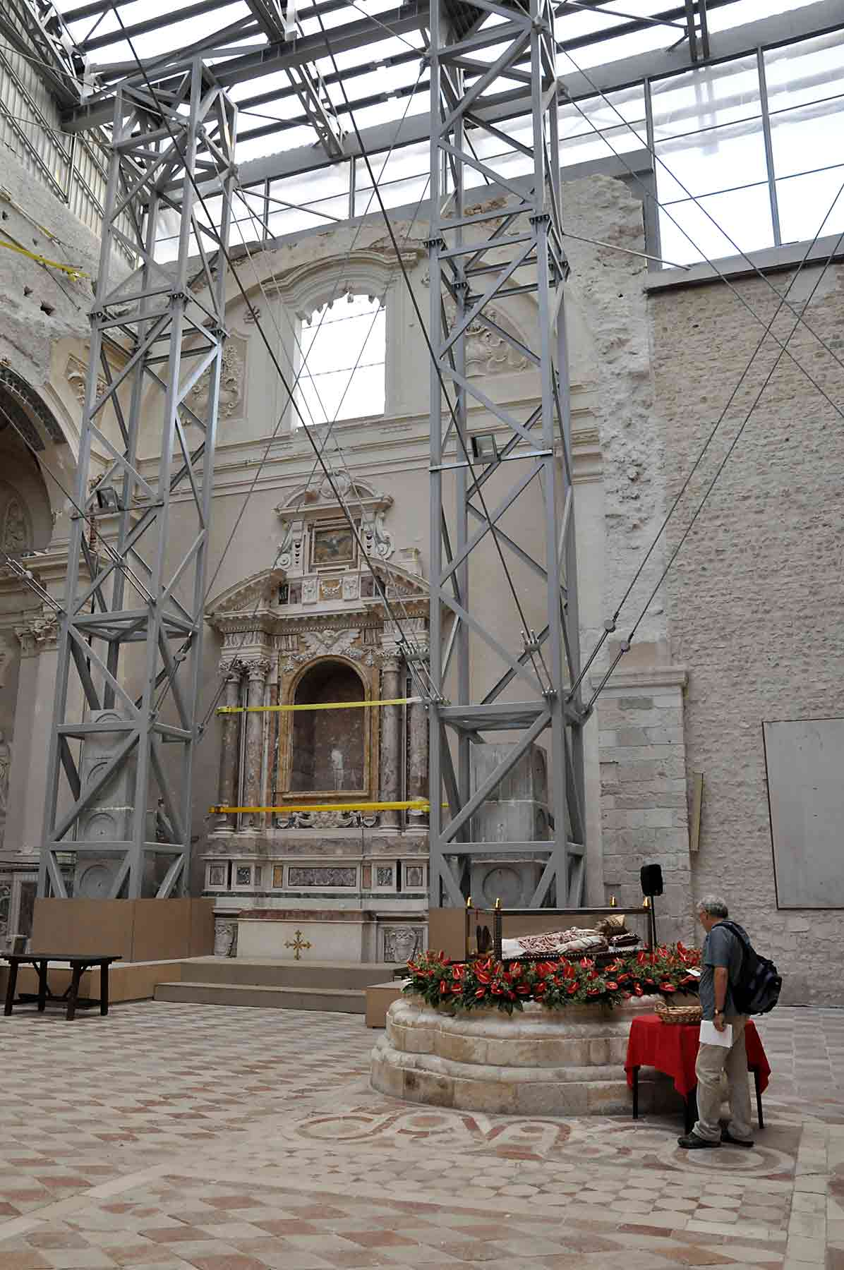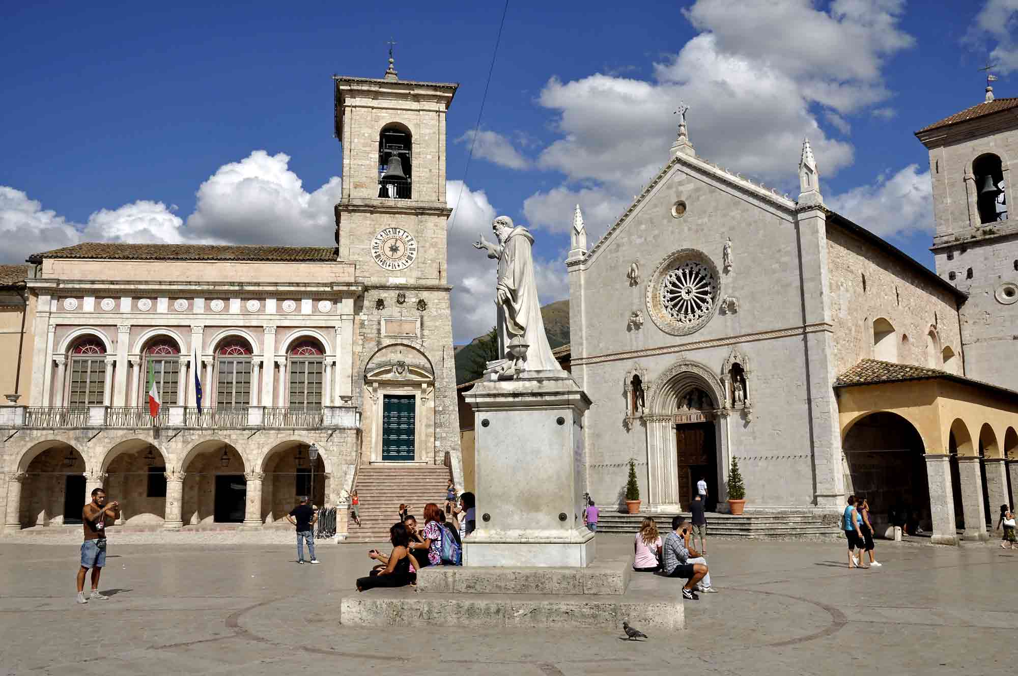 Następnego dnia (niedziela) pogoda była ładna, a w górach nie odczuwało się już takiego upału jak w Rawennie. Wyruszyliśmy autobusem na objazd Gór Sybillińskich. Droga wspięła się najpierw serpentynami na przełęcz s. Maria Maddalena (1515 m), a następnie jeszcze stromiej opadła w dolinę rzeki Fiastrone. Pierwszy dłuższy postój był w Visso, świetnie zachowanym średniowiecznym miasteczku, całym z kamienia, gdzie znajduje się siedziba parku narodowego. Dalej położone na skale opactwo s. Eutizio i Norcia – rodzinne miasto św. Benedykta. Norcia terytorialnie należy do Umbrii, tym samym nawiązaliśmy do poprzedniej wycieczki. Objechaliśmy góry od południa i przez Amandolę wrócili do Sarnano, które okazało się również czarującym miasteczkiem, dla odmiany zbudowanym z cegły.