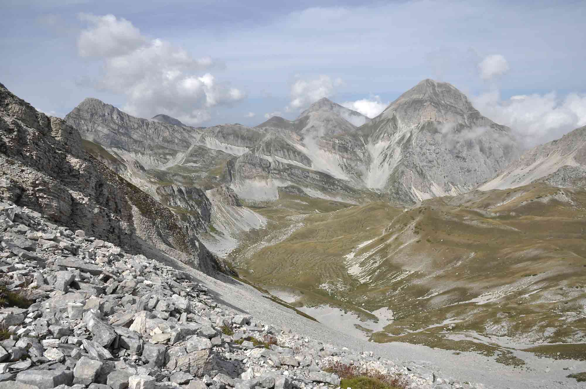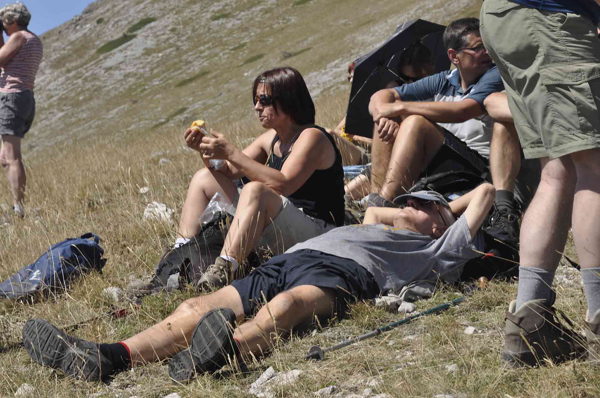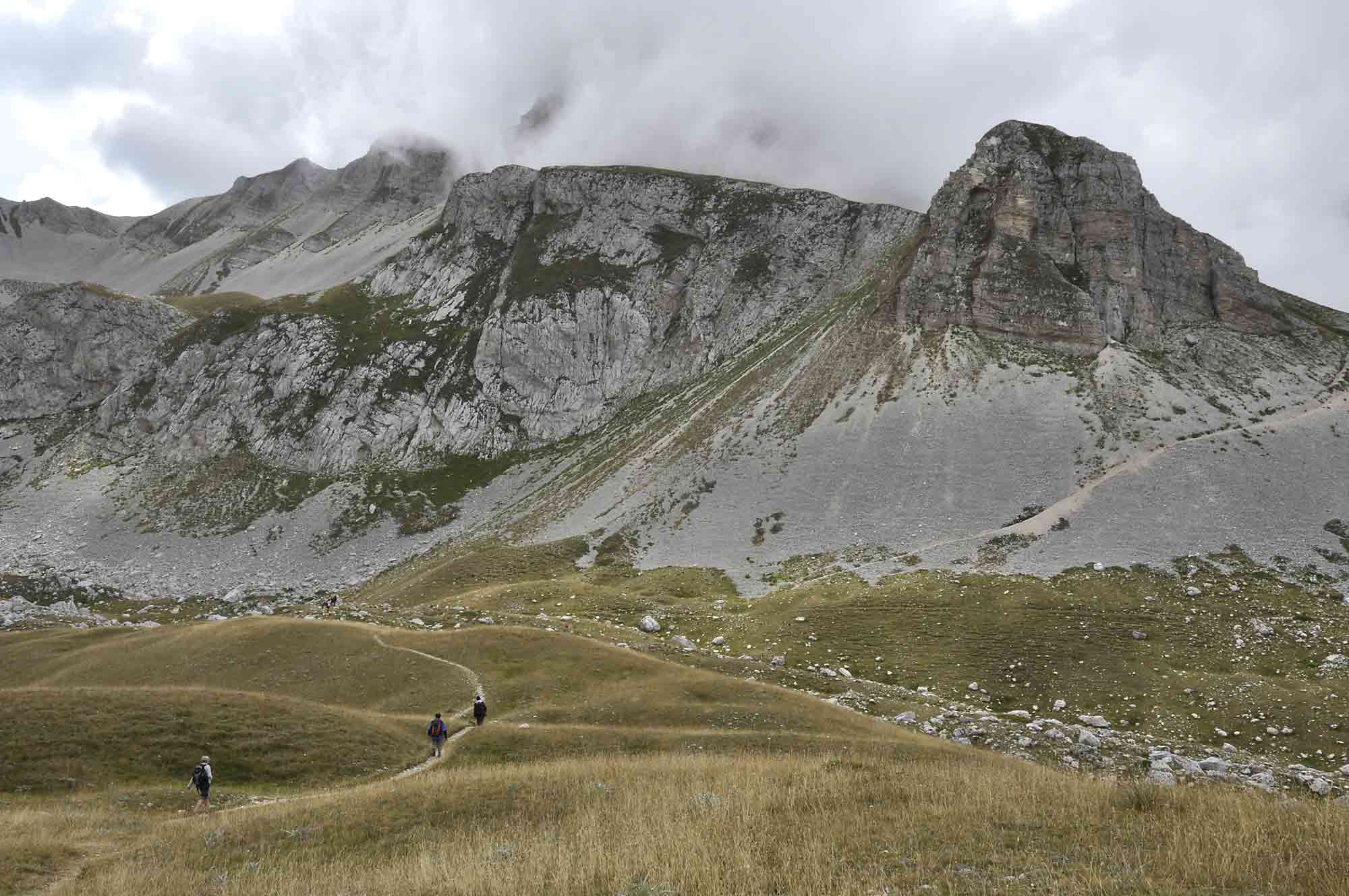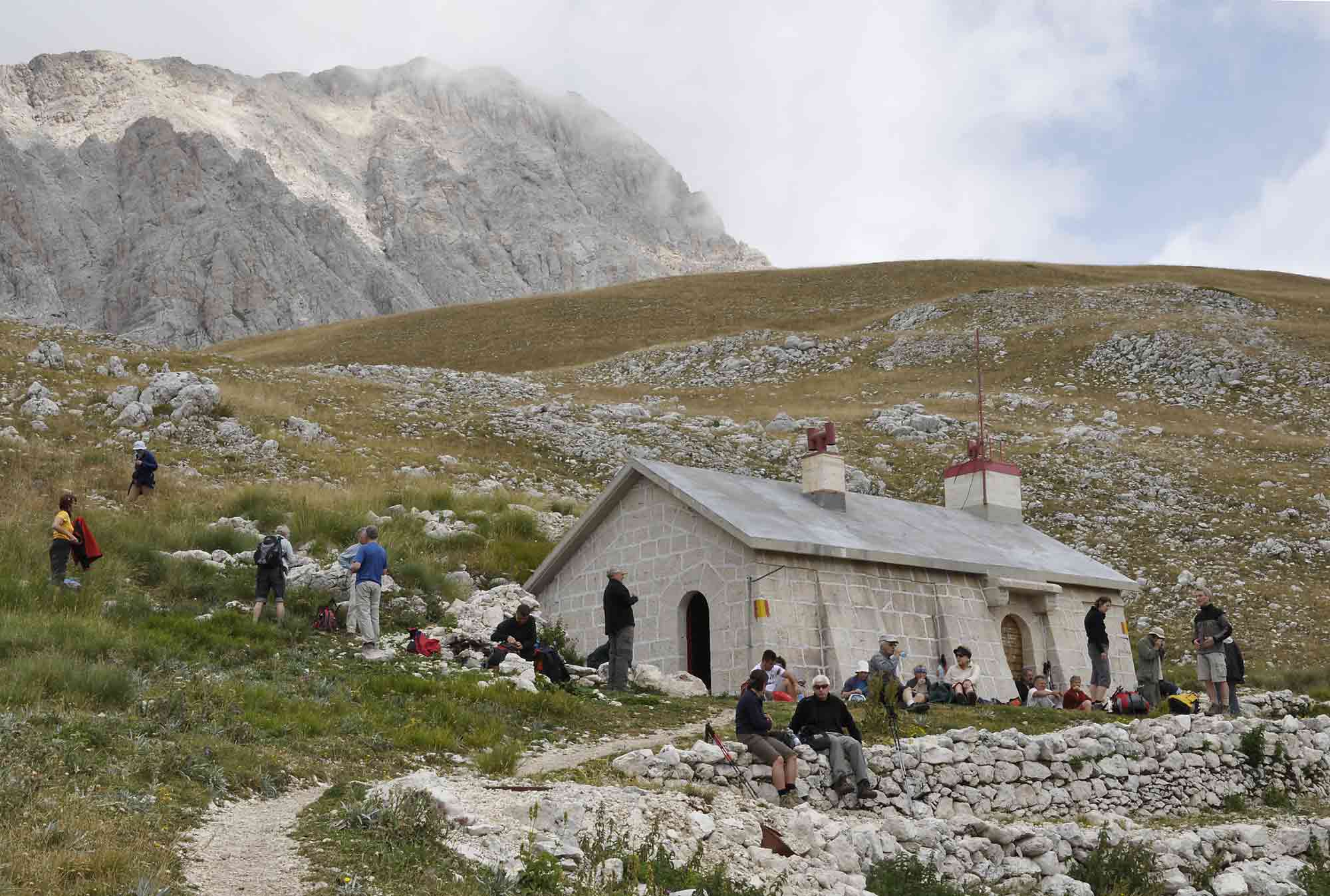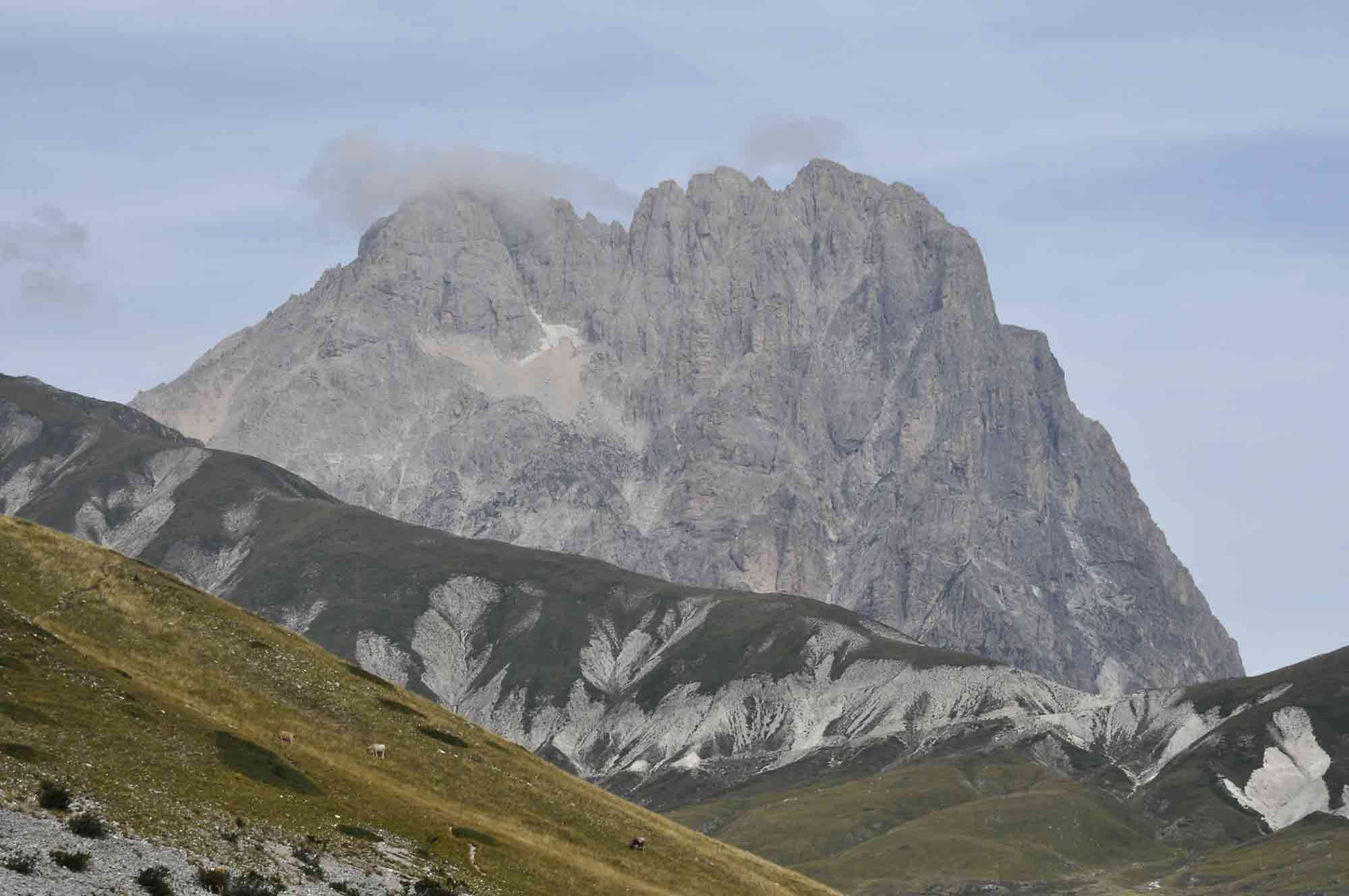 Na ostatnią wycieczkę zostawiliśmy sobie najwyższy w Apeninach masyw Gran Sasso – Italia, także objęty ochroną jako park narodowy. Autobusem wyjechaliśmy aż na Campo Imperatore, pod hotel paskudny, ale historyczny, ponieważ był miejscem odosobnienia, a potem porwania Mussoliniego. Ponieważ autobus wjechał na ponad 2000 m, bez kłopotu osiągnęliśmy położone na grani schronisko Duca degli Abruzzi (2388 m), a następnie zrobiliśmy piękną wycieczkę u podnóża Corno Grande, obchodząc dookoła Campo Pericoli.