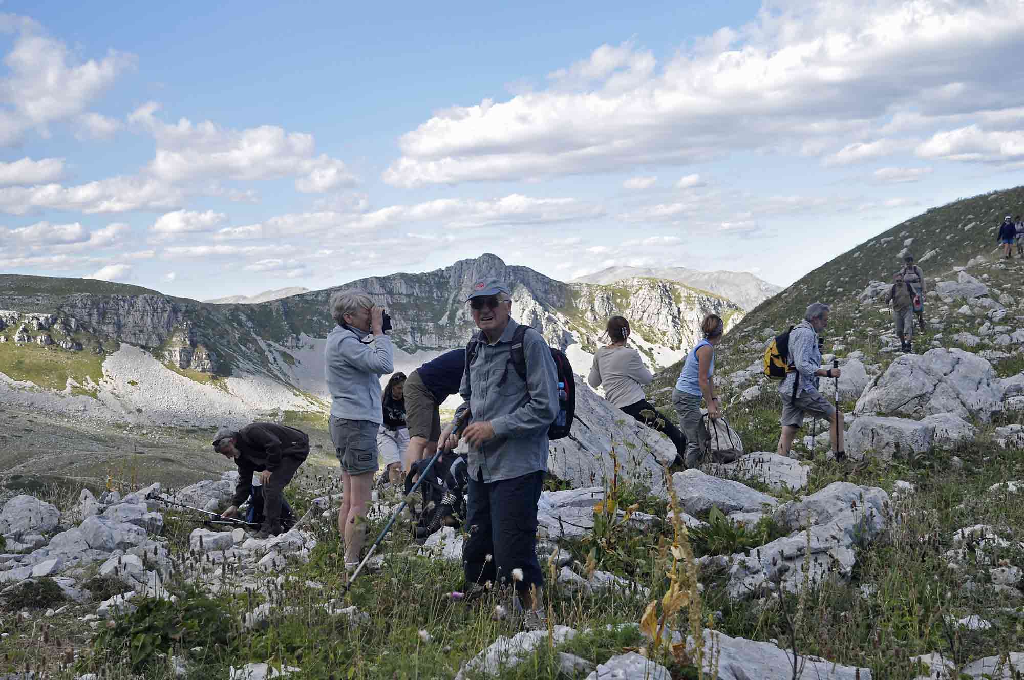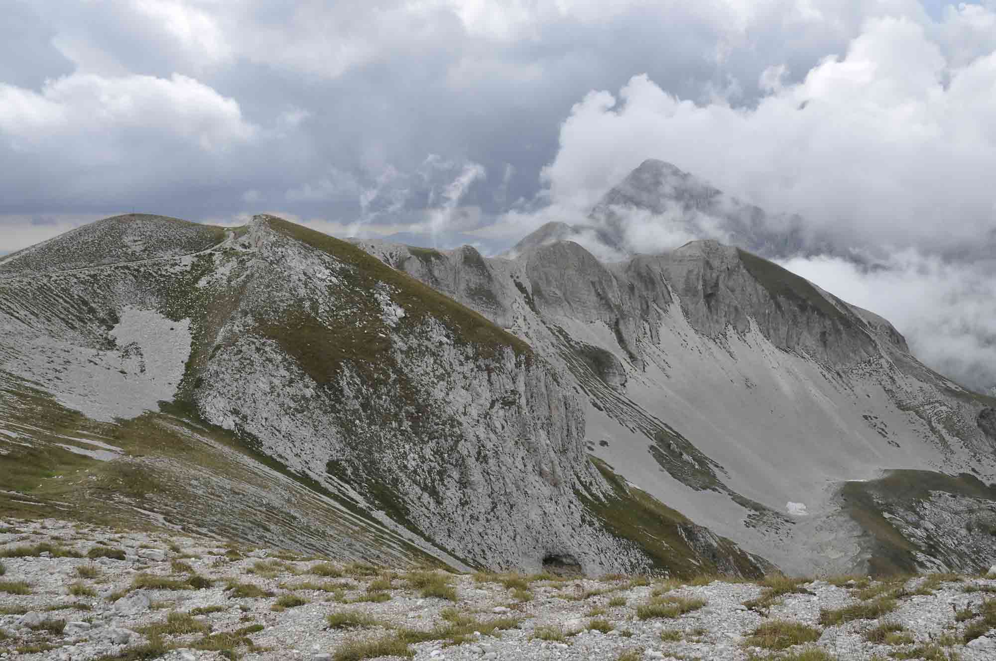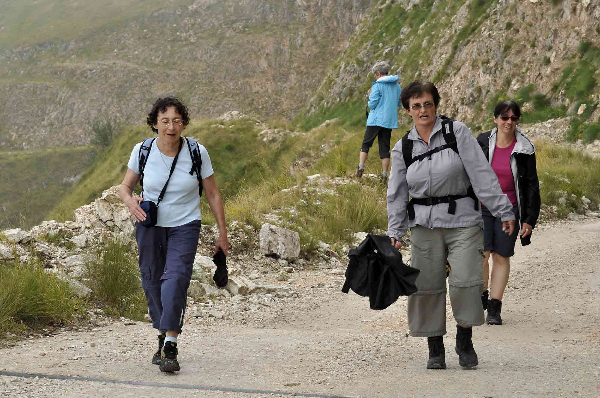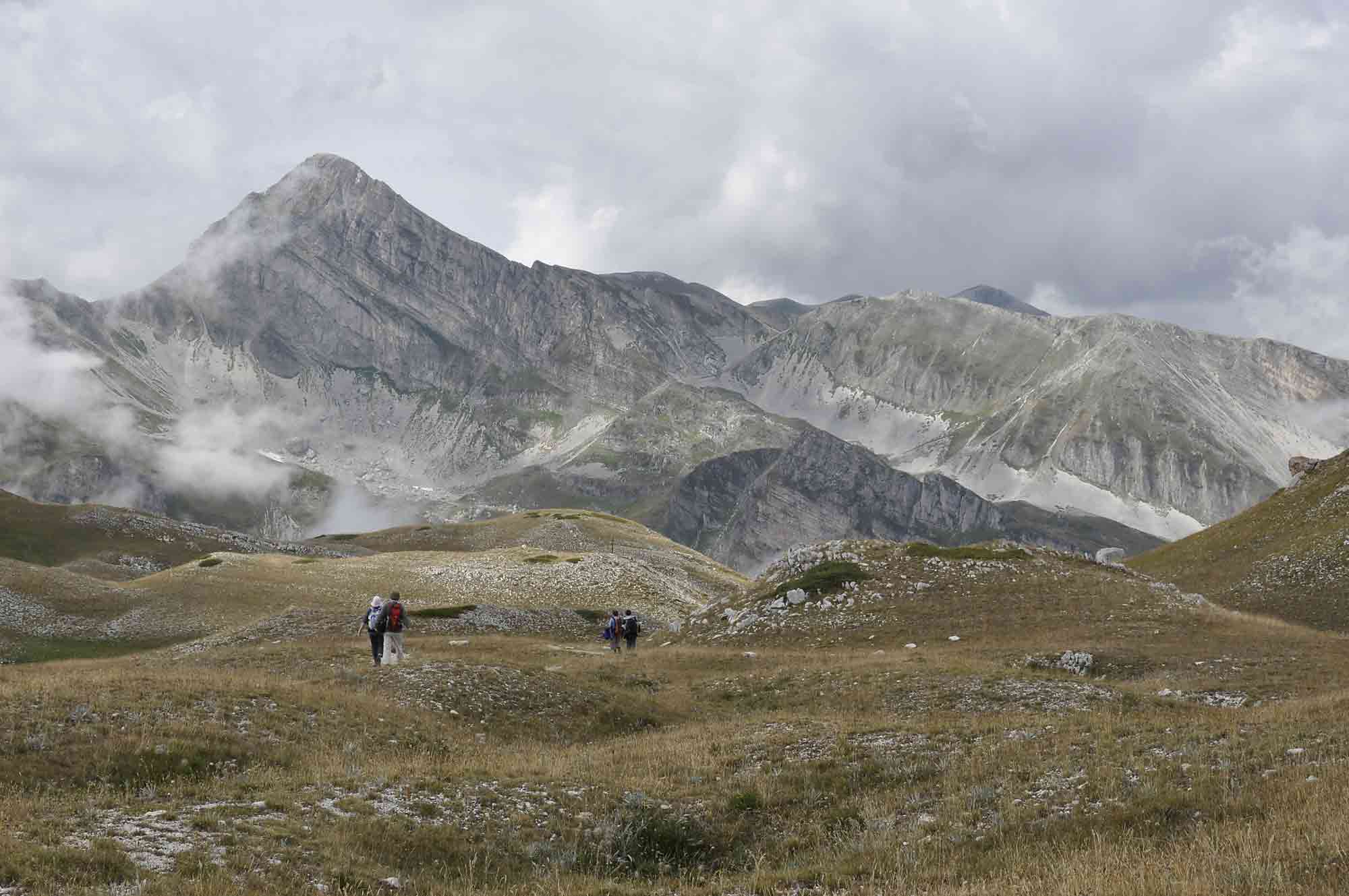 Na ostatnią wycieczkę zostawiliśmy sobie najwyższy w Apeninach masyw Gran Sasso – Italia, także objęty ochroną jako park narodowy. Autobusem wyjechaliśmy aż na Campo Imperatore, pod hotel paskudny, ale historyczny, ponieważ był miejscem odosobnienia, a potem porwania Mussoliniego. Ponieważ autobus wjechał na ponad 2000 m, bez kłopotu osiągnęliśmy położone na grani schronisko Duca degli Abruzzi (2388 m), a następnie zrobiliśmy piękną wycieczkę u podnóża Corno Grande, obchodząc dookoła Campo Pericoli.
