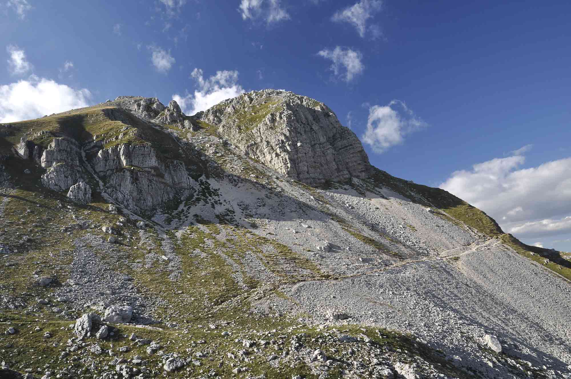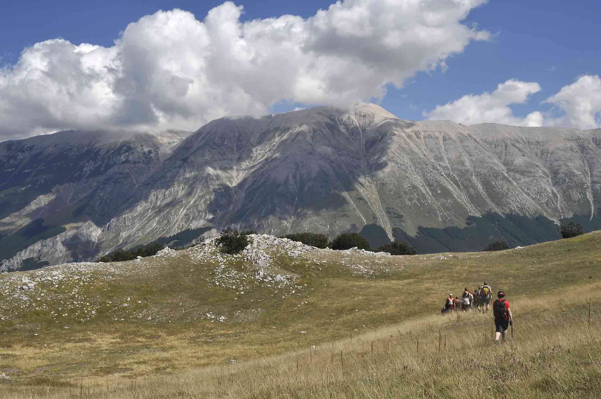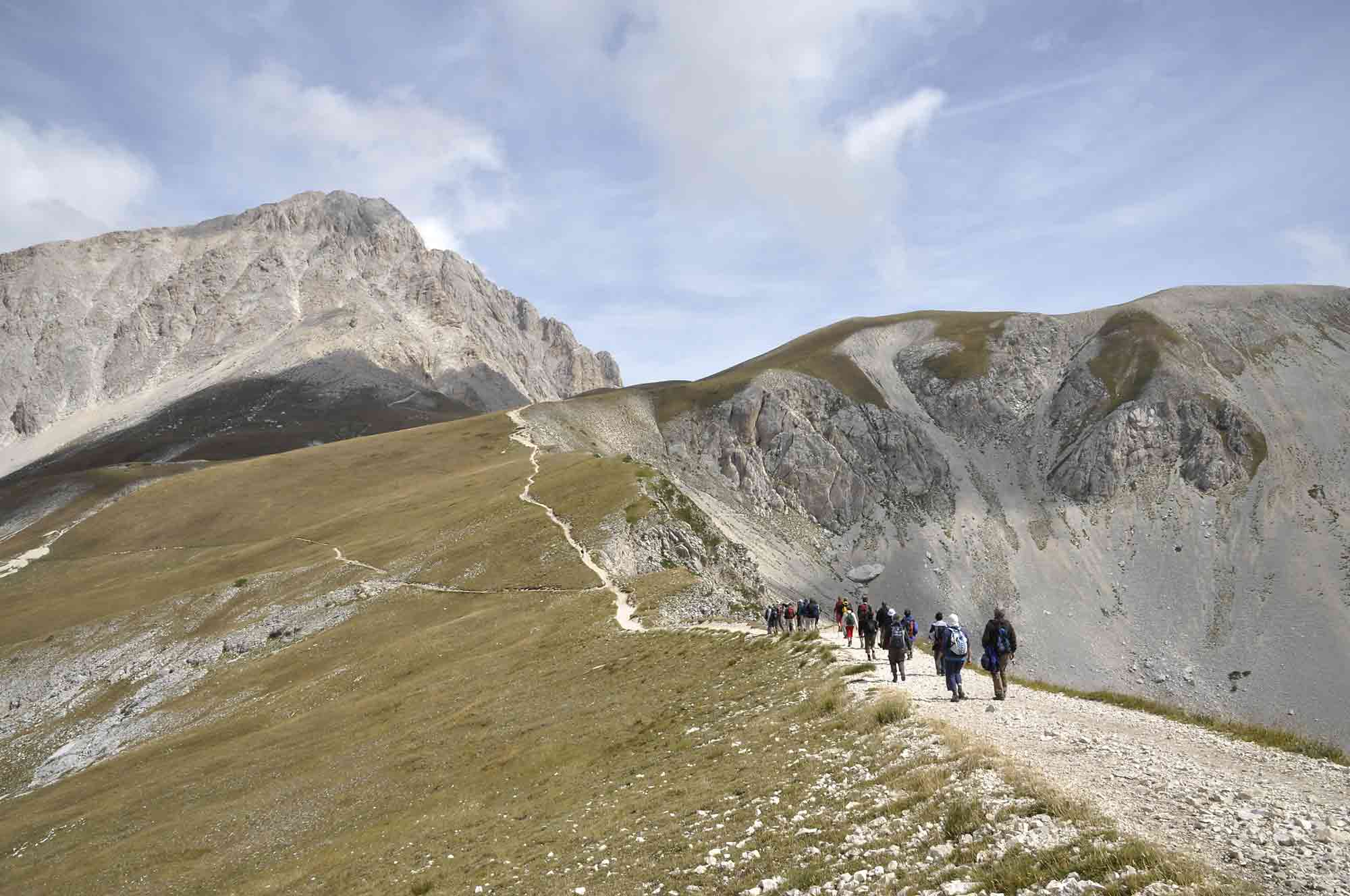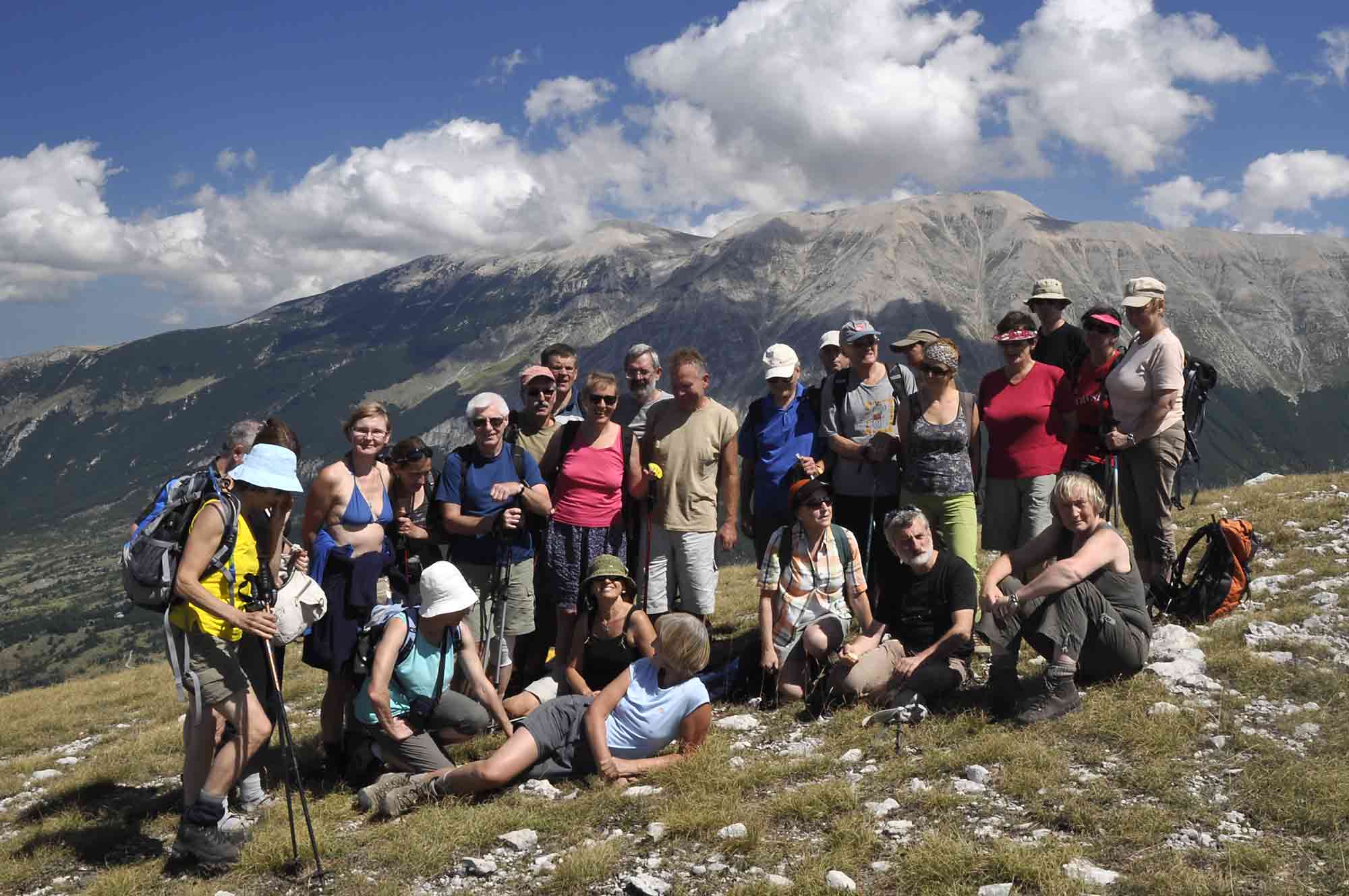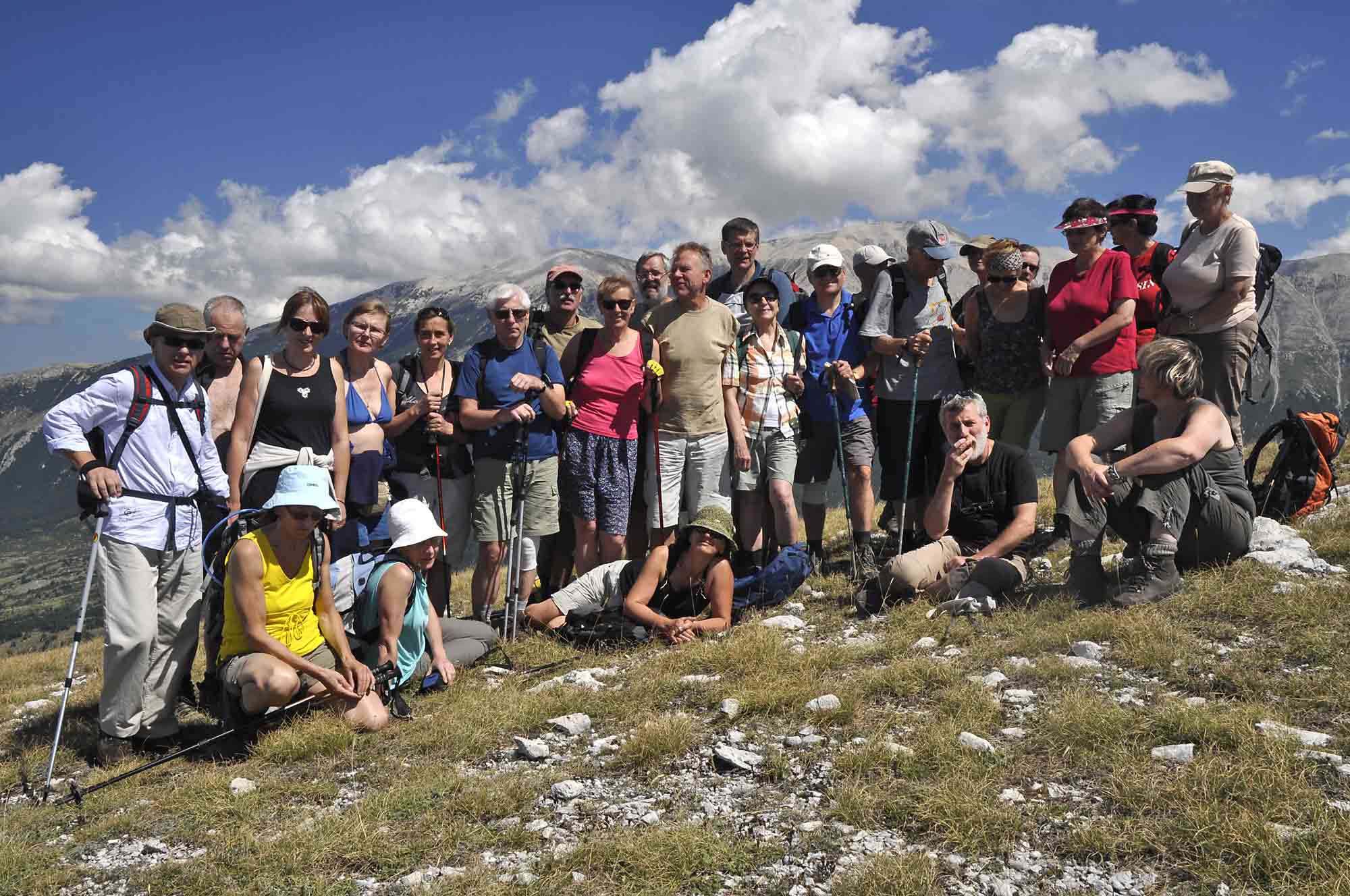 Na ostatnią wycieczkę zostawiliśmy sobie najwyższy w Apeninach masyw Gran Sasso – Italia, także objęty ochroną jako park narodowy. Autobusem wyjechaliśmy aż na Campo Imperatore, pod hotel paskudny, ale historyczny, ponieważ był miejscem odosobnienia, a potem porwania Mussoliniego. Ponieważ autobus wjechał na ponad 2000 m, bez kłopotu osiągnęliśmy położone na grani schronisko Duca degli Abruzzi (2388 m), a następnie zrobiliśmy piękną wycieczkę u podnóża Corno Grande, obchodząc dookoła Campo Pericoli.