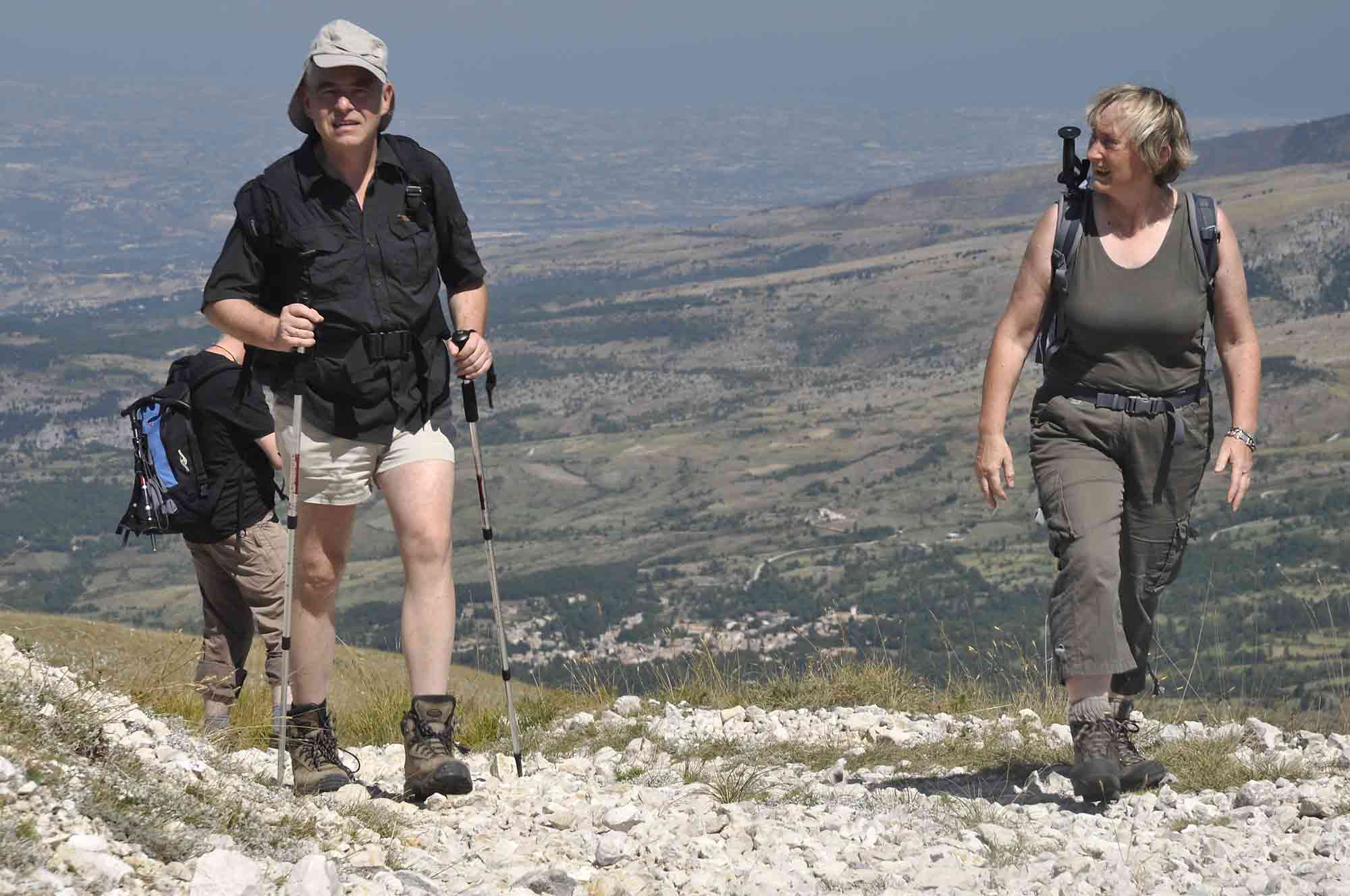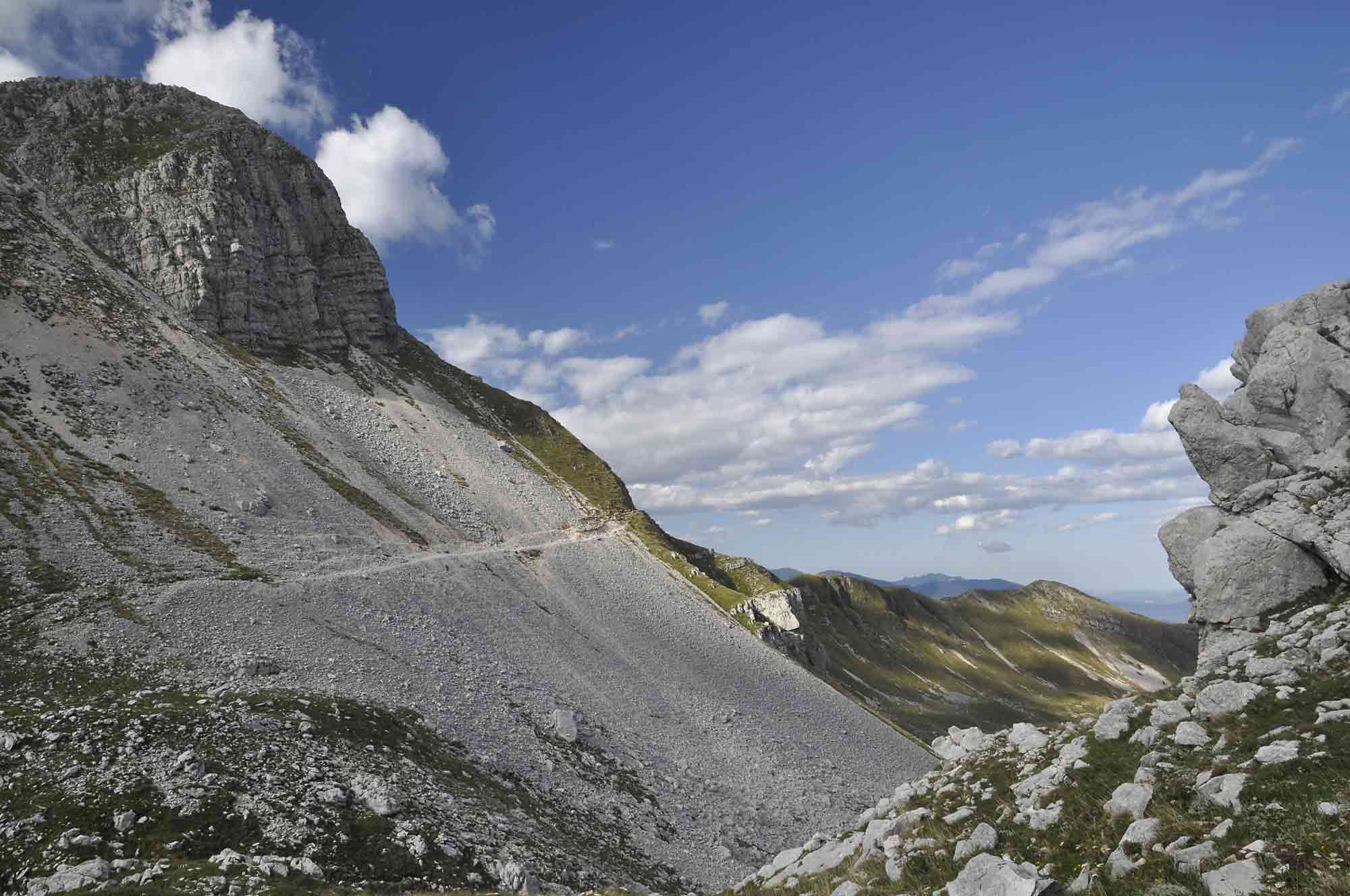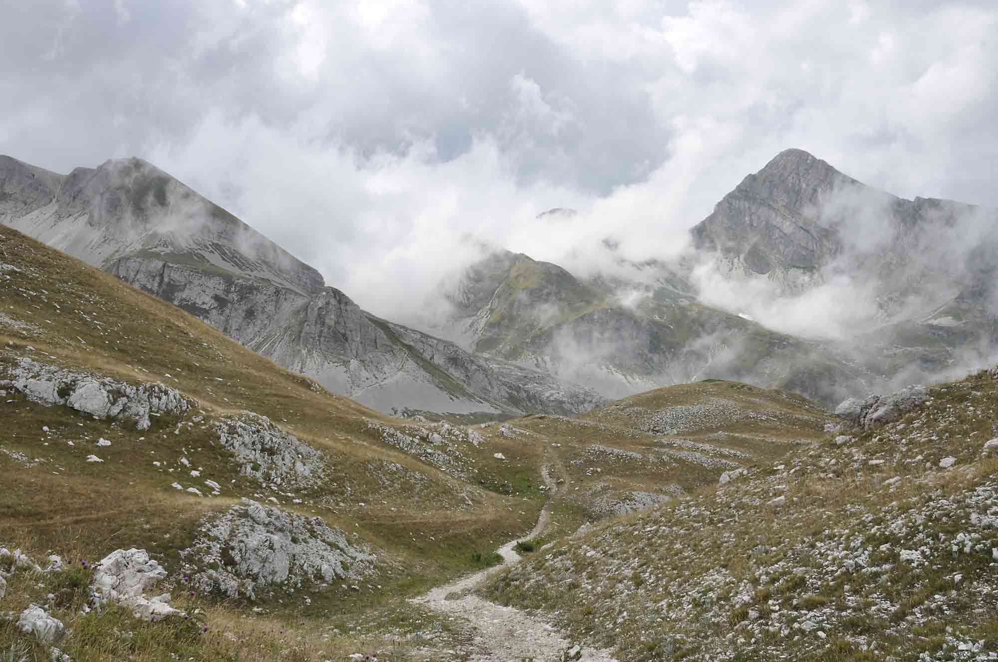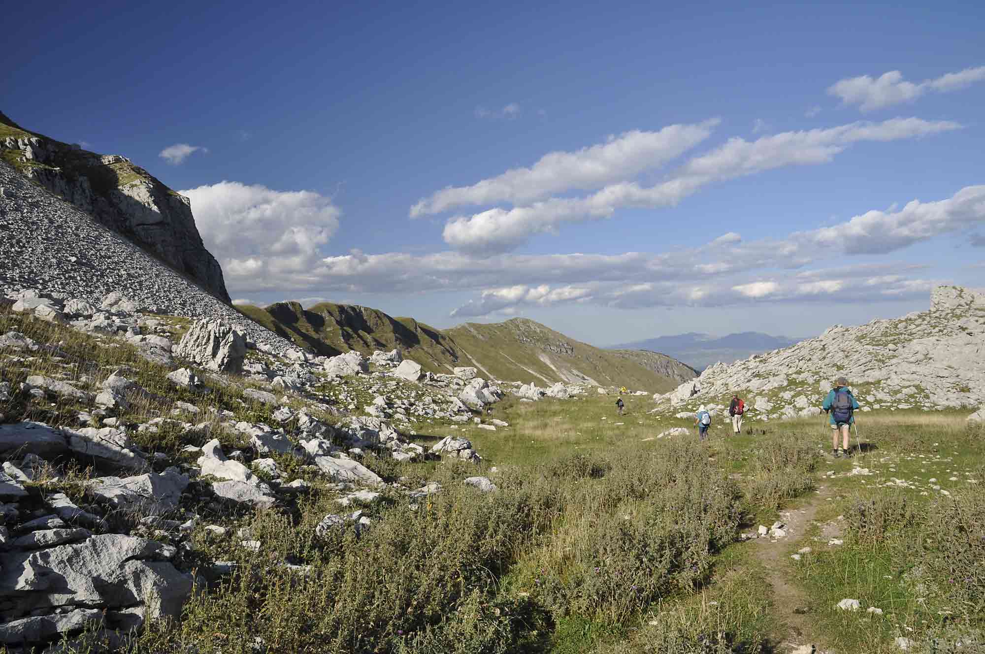 Na ostatnią wycieczkę zostawiliśmy sobie najwyższy w Apeninach masyw Gran Sasso – Italia, także objęty ochroną jako park narodowy. Autobusem wyjechaliśmy aż na Campo Imperatore, pod hotel paskudny, ale historyczny, ponieważ był miejscem odosobnienia, a potem porwania Mussoliniego. Ponieważ autobus wjechał na ponad 2000 m, bez kłopotu osiągnęliśmy położone na grani schronisko Duca degli Abruzzi (2388 m), a następnie zrobiliśmy piękną wycieczkę u podnóża Corno Grande, obchodząc dookoła Campo Pericoli.