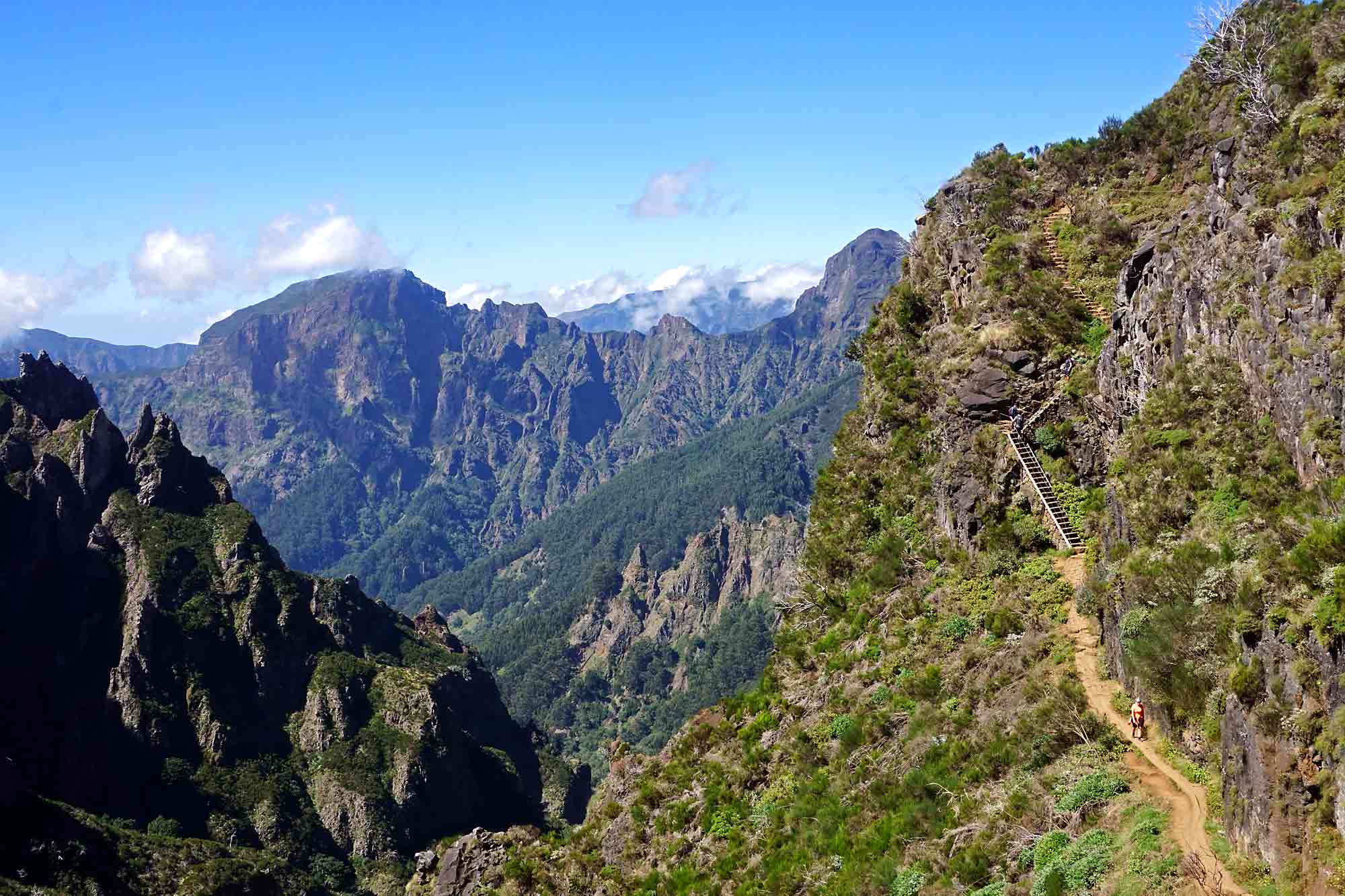 Następnego dnia, przy pięknej pogodzie, wybraliśmy się w góry. Autobusem wyjechaliśmy pod Pico do Arieiro (1805 m), gdzie znajduje się duża stacja radarowa i restauracja. Najpierw całą grupą poszliśmy ok. kilometra wysokogórskim szlakiem prowadzącym na Pico Ruivo. Przy drugim „miradorze” rozdzieliliśmy się. Czteroosobowa grupa uderzeniowa kontynuowała wycieczkę, a pozostali wrócili na Pico do Arieiro i autobusem przejechali na Achada do Teixeira (1592 m) skąd na Pico Ruivo prowadzi łatwy szlak. Obie grupy spotkały się ponownie w schronisku, skąd na szczyt Pico Ruivo (1862 m) było już niedaleko. Cały dzień utrzymała się piękna pogoda (co wcale nie jest typowe!) i można było podziwiać wspaniałe widoki.